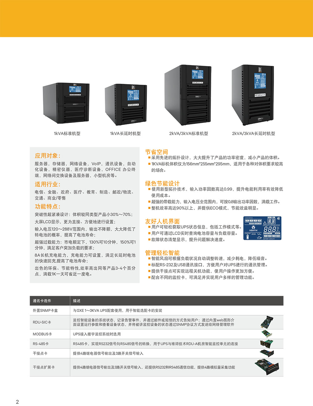 Vertiv Liebert GXE 系列 UPS 是基于 IT 行業交流不間斷電源的應用動態,采用新拓撲,研發生產的全新一代塔式,單進單出,在線式高性能 UPS 產品。 通過突出性能及環保特性,滿足中小機房IT類設備的最新應用,全面提升小功率段塔式 UPS 商業競爭力。
